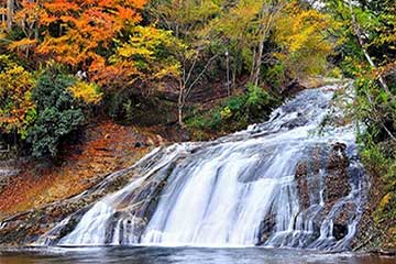関東屈指の紅葉の名瀑布。100mにわたってゆるやかな岩肌を流れ落ちるこの滝と周辺は、川面を秋風が渡る頃、紅葉で赤く色付きます。
