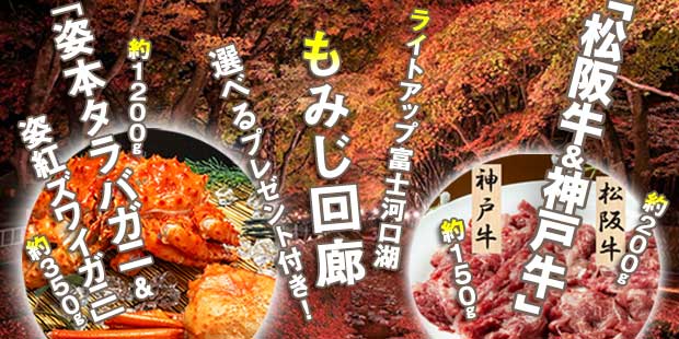 大迫力!約1200g姿本タラバガニ&約350g姿紅ズワイガニ、または日本三大和牛!松阪牛約200g&神戸牛約150gをお持ち帰りとライトアップ富士河口湖もみじ回廊
