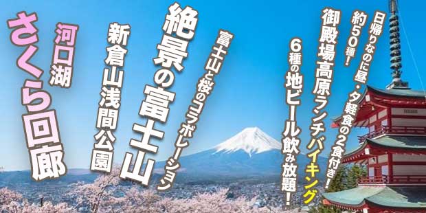 絶景の富士山と新倉山浅間公園&約200本の河口湖さくら回廊 - 日本が誇る”富士山”と”桜”のコラボレーション&日帰りなのに2食付き!