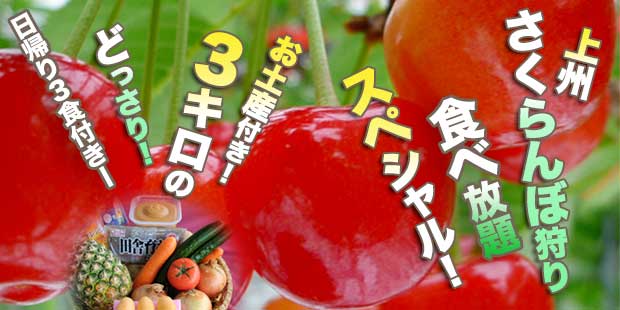 上州ブランド高級果実さくらんぼ狩り食べ放題スペシャル! - 高級果実狩り&「パイナップルや季節野菜などなんと3キロのお土産」が付いて、さらに日帰り3食付き!
